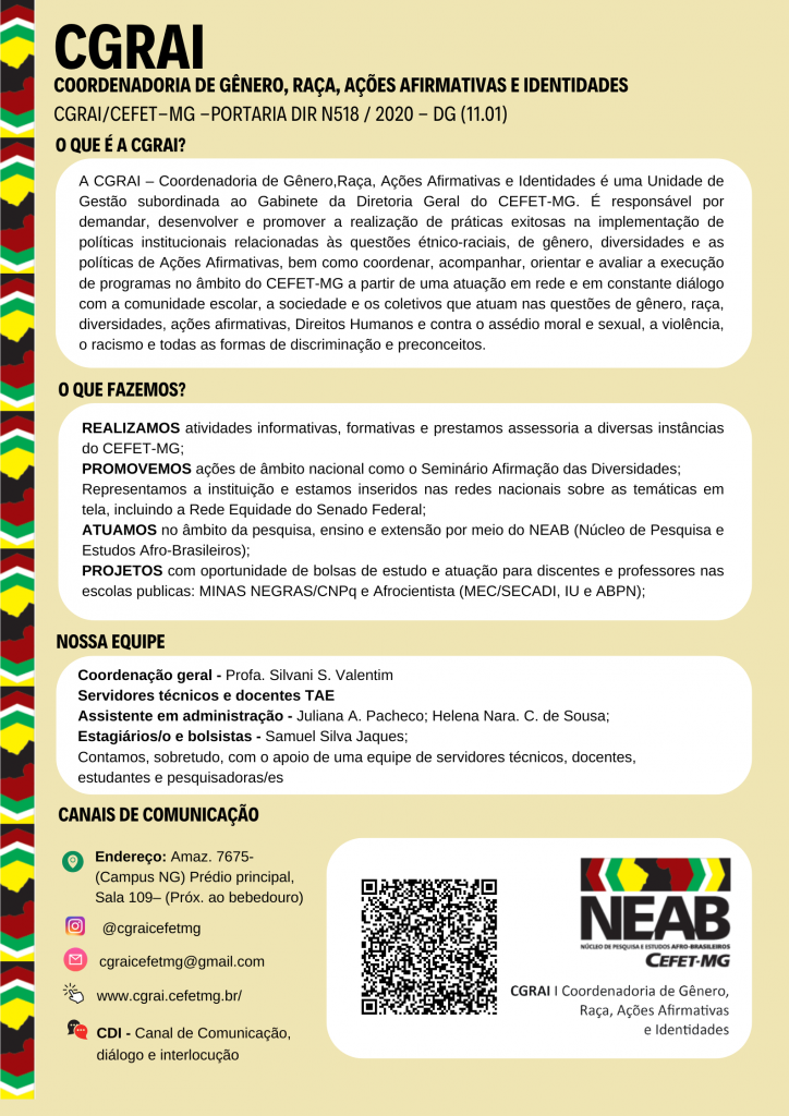 A CGRAI – Coordenadoria de Gênero, Raça, Ações Afirmativas e Identidades é uma Unidade de Gestão (UG) subordinada ao Gabinete da Diretoria Geral do CEFET-MG.